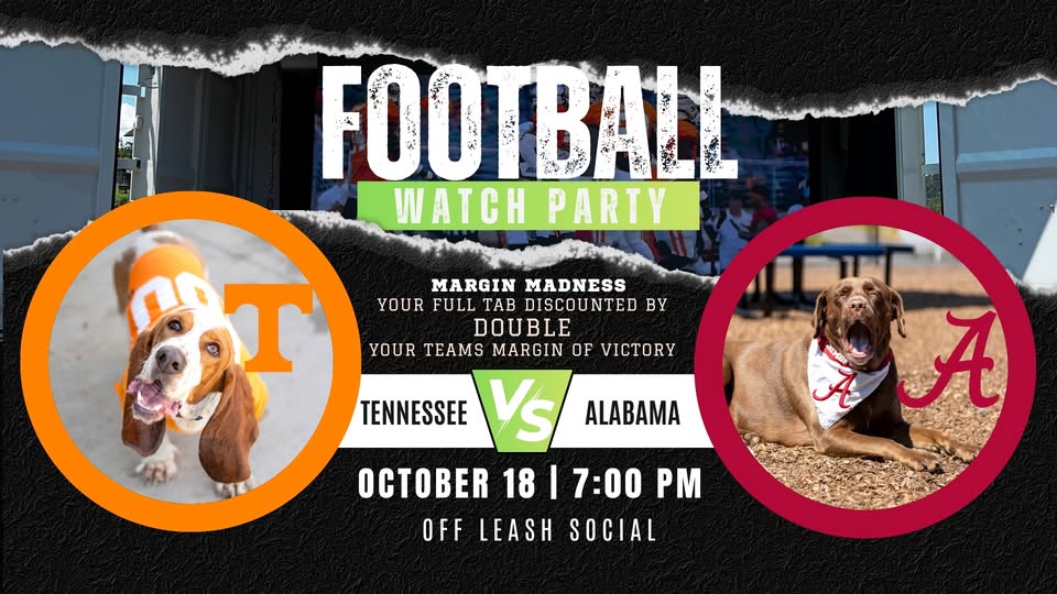 Tennessee vs. Alabama on the JUMBOTRON at Off Leash Social Oct 18 7:00 pm - 10:00 pm Tennessee vs. Alabama on the JUMBOTRON at Off Leash Social