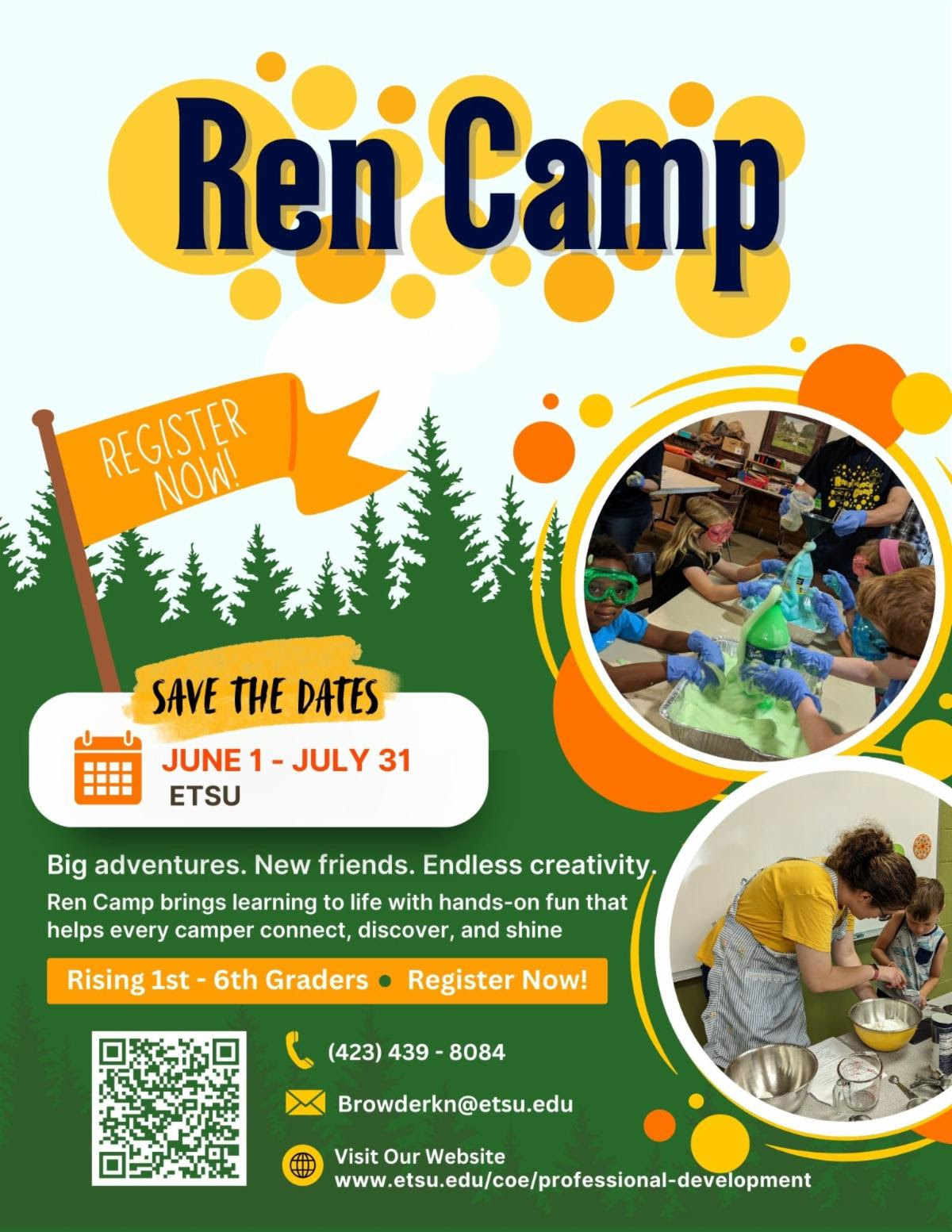 Ren Camp is designed to provide kids, rising 1st graders - 6th graders, with fun, educational, and social experiences outside of the classroom. · Outdoor adventures (hiking, swimming-every sunshiny week! sports) · Arts and crafts · Music and drama · Team-building games · STEM or educational workshops · Nature exploration For more information scan the QR code or call 423-439-8084.