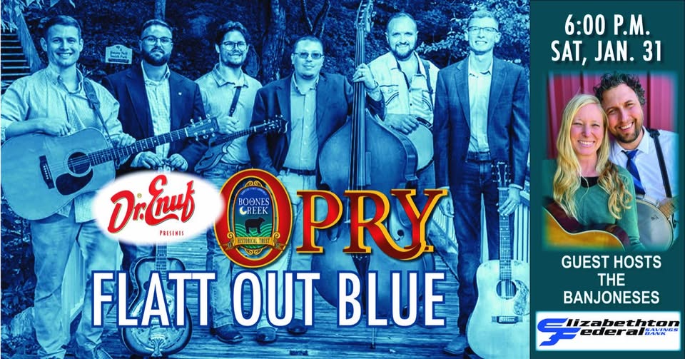 DR. ENUF presents FLATT OUT BLUE based out of southwest Virginia and Northeast Tennessee. Six guys who are inspired by the Stanley Brothers, Flatt & Scruggs, and Doyle Lawson. The band is made up of: Jordan & Jacob McPherson - sibling duo, Isaac Saults - upright bass, Corey Nelms - dobro, Breaden Christian - guitar, vocals. You’re gonna love ‘em! Saturday, January 31, show starts at 6:00 p.m. followed by Open Mic. Boones Creek Opry 632 Hales Chapel Rd, Gray, TN Admission 8 bucks. Come hungry - we serve the best - Hamilton Meat hot dogs & chili.